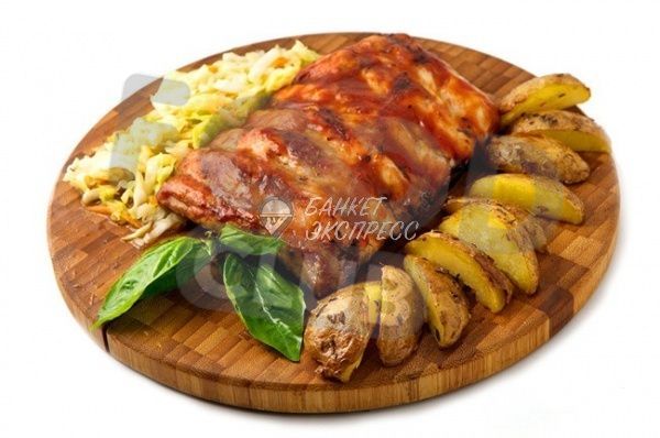 Ребра свиные в медово-горчичном соусе с запеченым картофелем с пряной морковью и лавашом