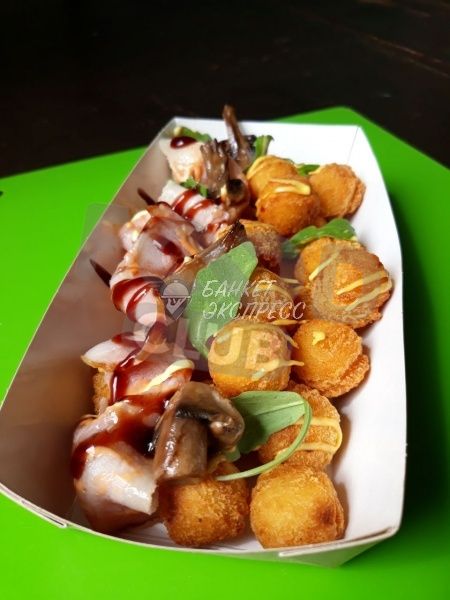 Картофельные шарики с чипсами из бекона, грибами и сырным соусом
