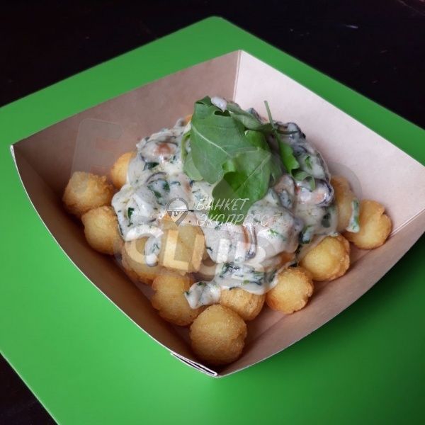 Картофельные шарики с мидиями в сливочно-шпинатном соусе