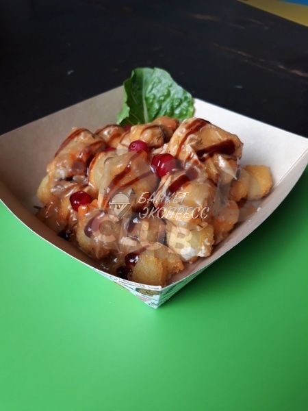 Картофельные шарики с томлеными говяжьими щечками в клюквенном соусе