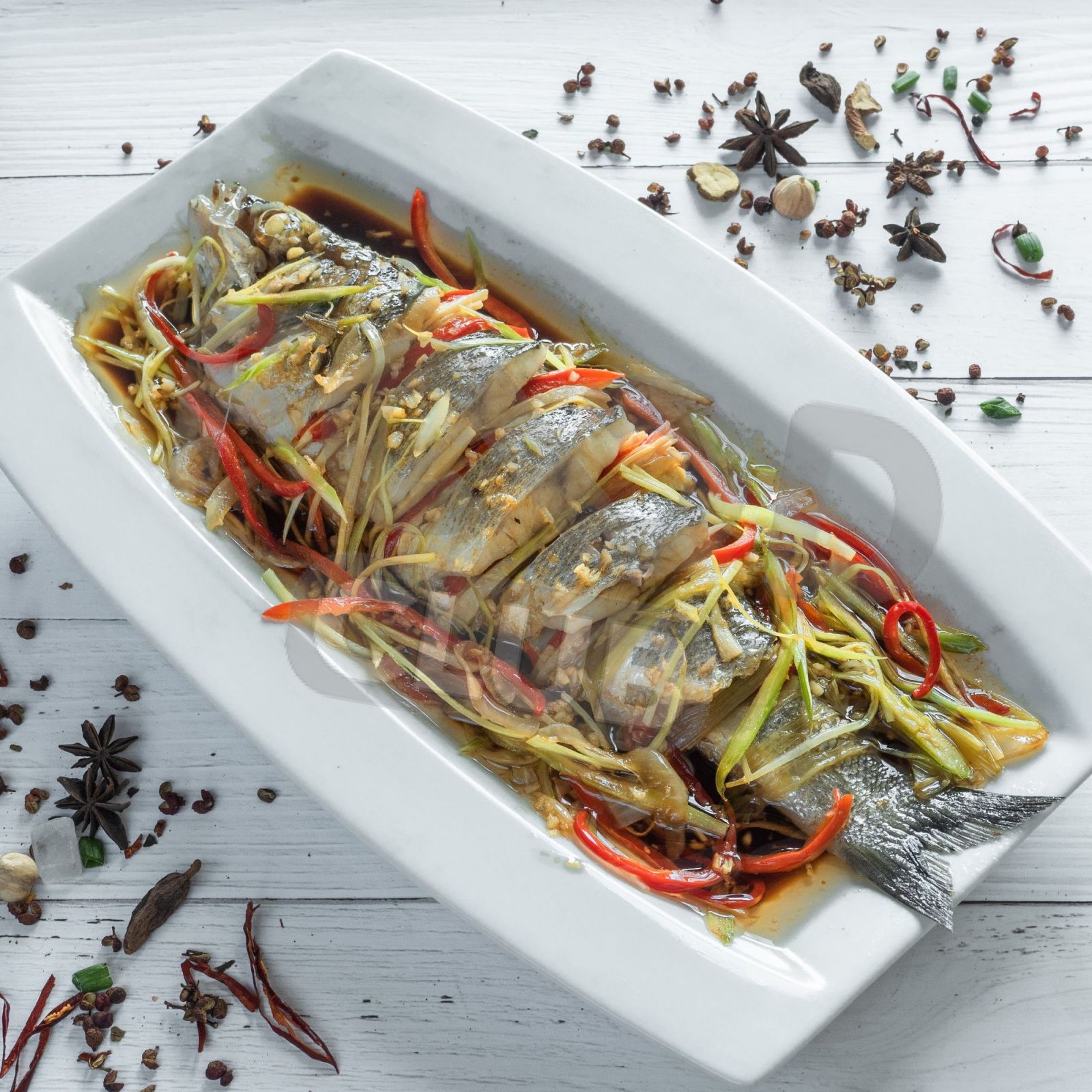 Состав: Сибас, сельдерей, болгарский перец, лук-порей, перец Чили, имбирь, соевый соус.