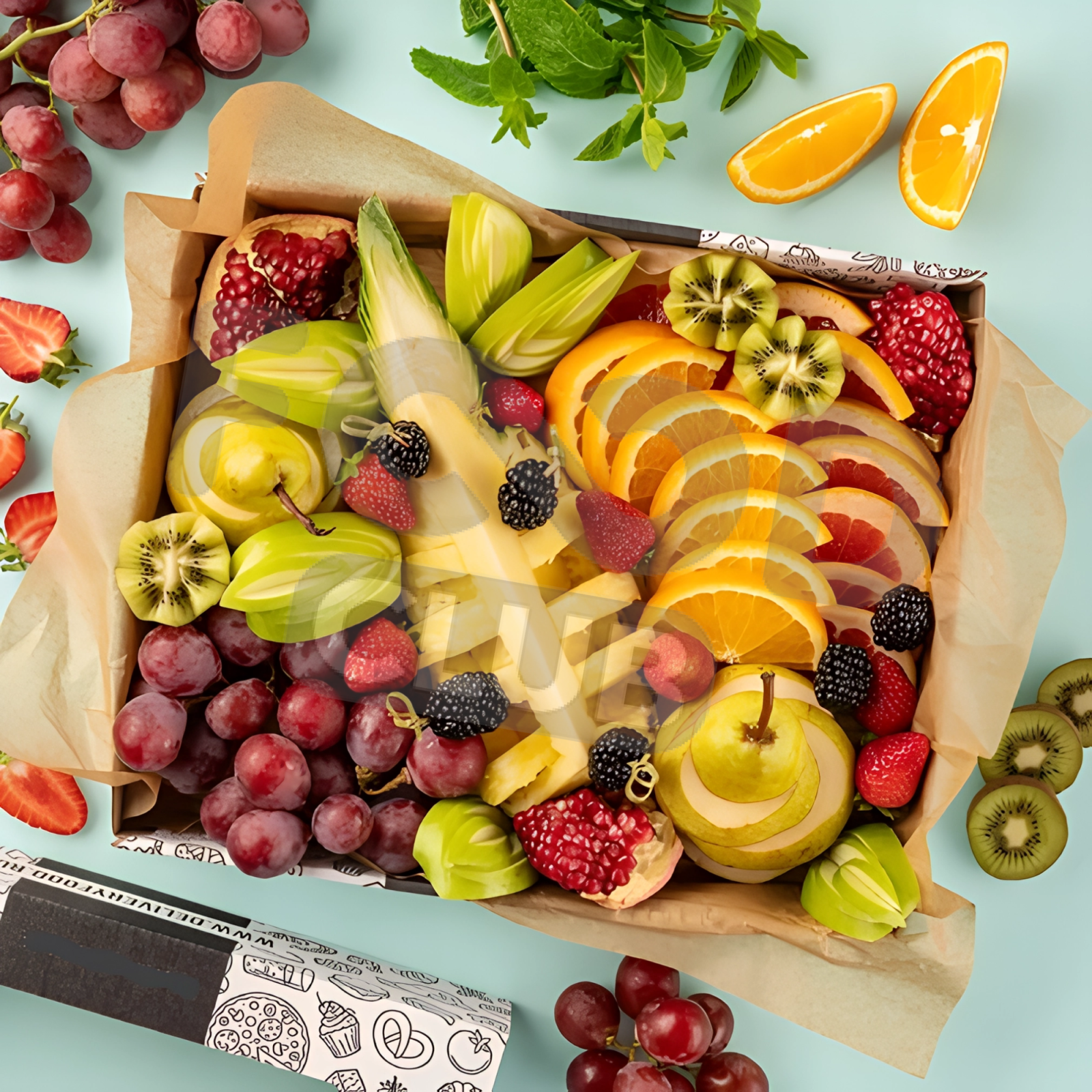 Хотите добавить вашему праздничному столу свежести, ярких красок и витаминов? Тогда фруктовый фудбокс - именно то, что вам нужно. Мы собрали в нем самые популярные экзотические и местные фрукты, а потом представили их в эстетически привлекательной и оригинальной подаче. Дольки ароматного грейпфрута и апельсина, гроздь десертного красного винограда, сезонные ягоды, зерна граната и ломтики груши, киви и ананас – потрясающая комбинация вкуса, цвета, аромата, несущая пользу здоровью. Подавайте такой фудбокс в качестве аперитива, десерта или самостоятельной закуски к вину. А можете просто побаловать таким набором ваших детей – витаминов и счастливых детских улыбок много не бывает.
