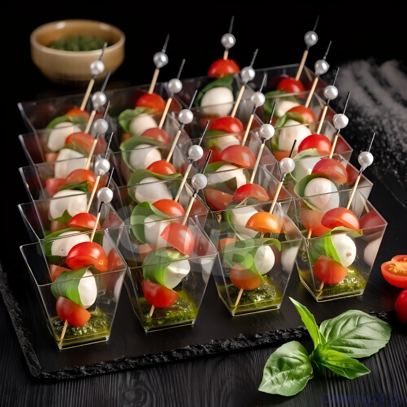 Традиционная закуска из сыра тофу с сочным томатом черри и листиком свежего базилика в фуршетном исполнении.