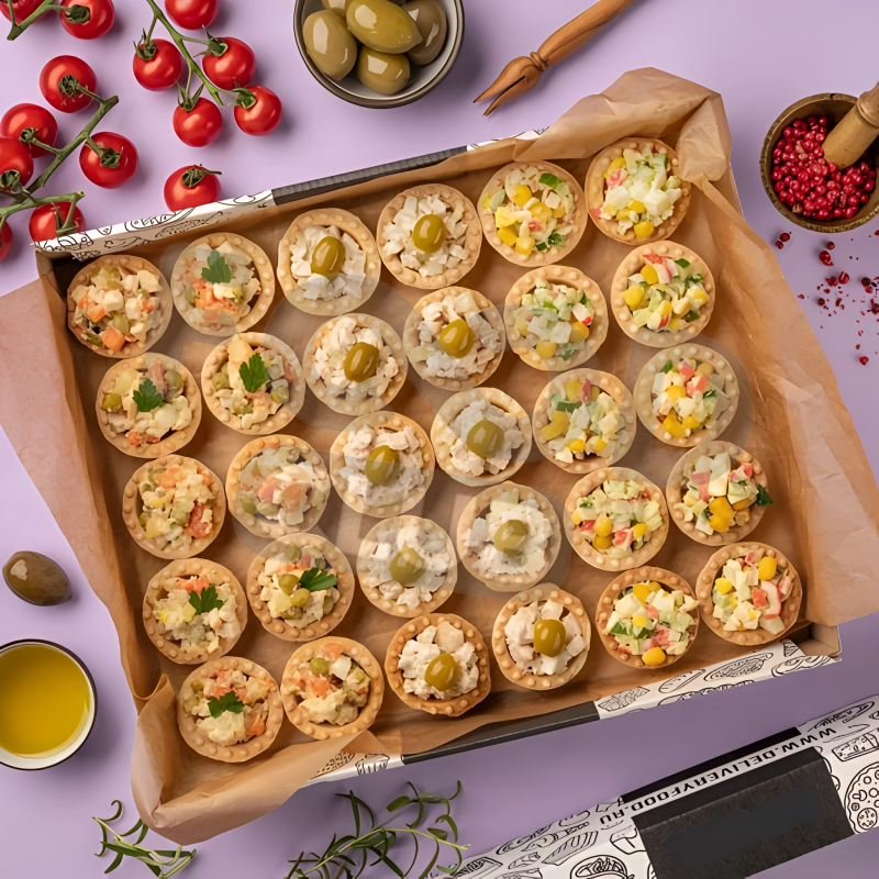 Тарталетка из песочного теста, куриное филе, майонез, сельдерей, крабовые палочки, яйцо, картофель, кукуруза консервированная, огурцы, морковь, соус соевый, горошек консервированный, оливки, петрушка, укроп, чеснок, перец черный.