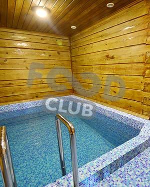 - На первом этаже расположен банкетный зал с бытовой техникой, ЖКИ телевизором и мебелью. В соседнем помещении бассейн 3х3 метра, подвесной купелью, душевыми и большой русской парной.