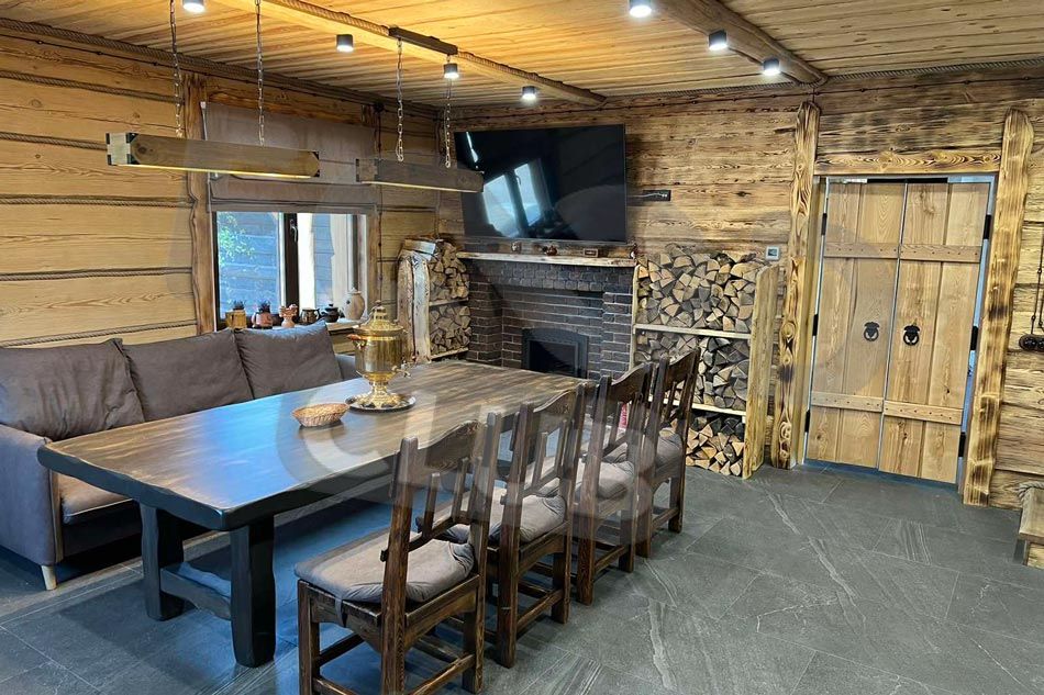 - Также на первом этаже расположена отдельная уютная комната отдыха с бытовой техникой, посудой, тульским самоваром.