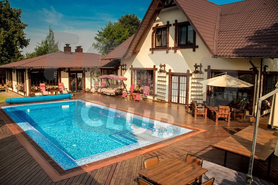 На первом этаже дома: бильярдный зал с 7-ми футовым столом, прихожая с большим межкомнатным аквариумом, санузел, кабинет, зимний сад, выполненном в античном стиле и большая гостиная общей площадью 70 кв. м., выполненная по авторскому архитектурному проекту. Гостиная зонально поделена на обеденную зону, ультрасовременную кухню с винным баром, дискобар с танцполом, зону отдыха с домашним кинотеатром, проектором, биокамином и плазменным телевизором 60 дюймов с выходом в интернет. Из гостиной вы можете попасть на большую террасу площадью 200 кв.м. с плавательным бассейном 5х10м, детским городком. В летнее время терраса оборудована садовой мебелью, качелями, зонтиками и шезлонгами.